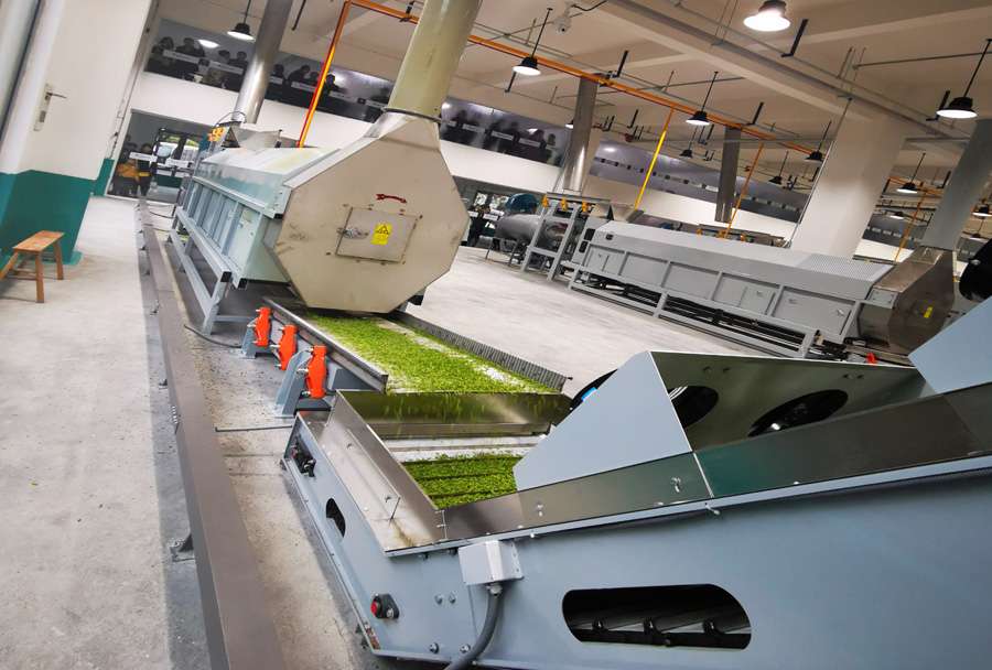 機組組成:本機組由鮮葉輸送機、超高溫熱風茶葉滾筒殺青機、冷卻輸送機、機組集成控制系統組成。